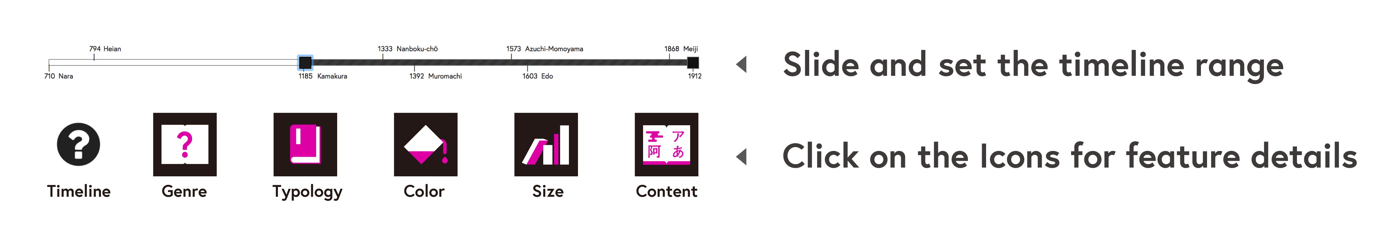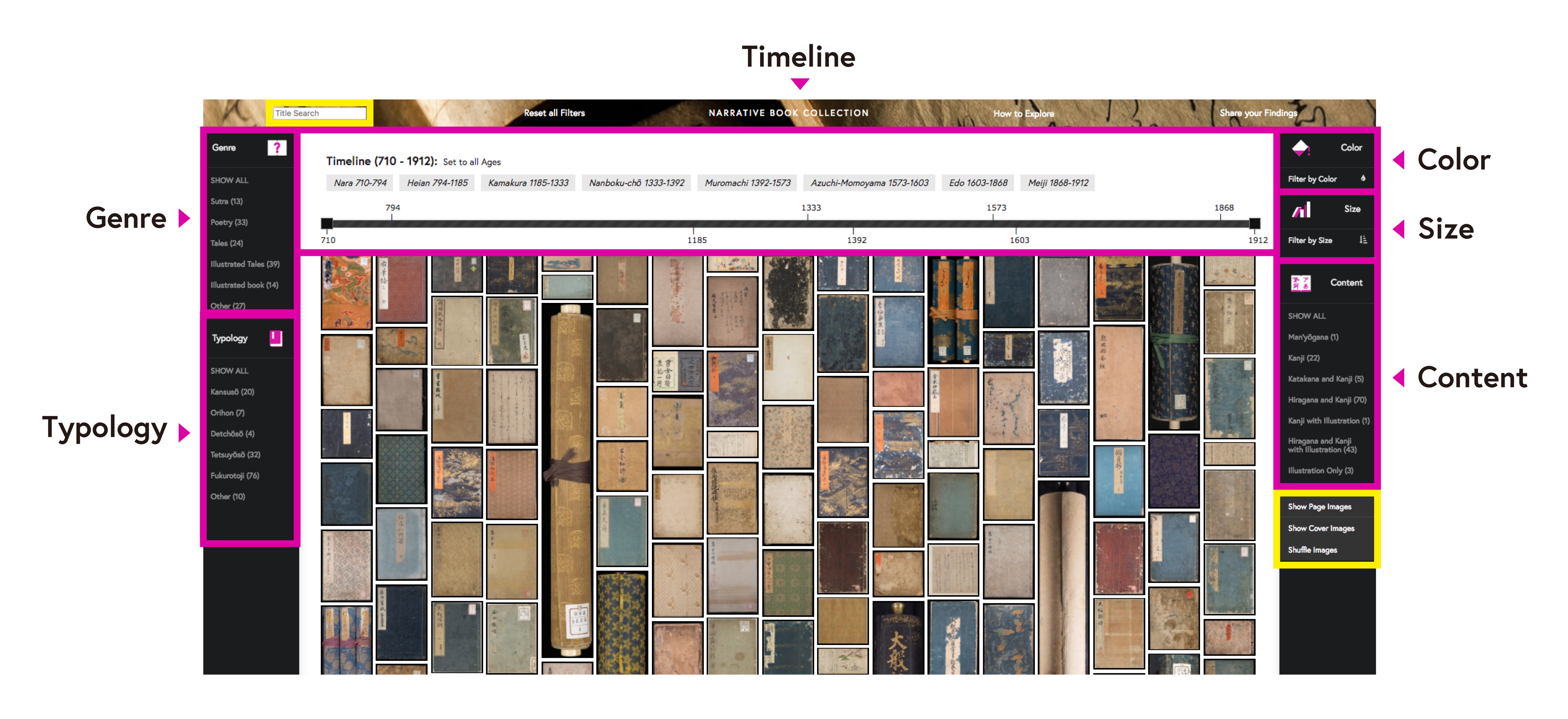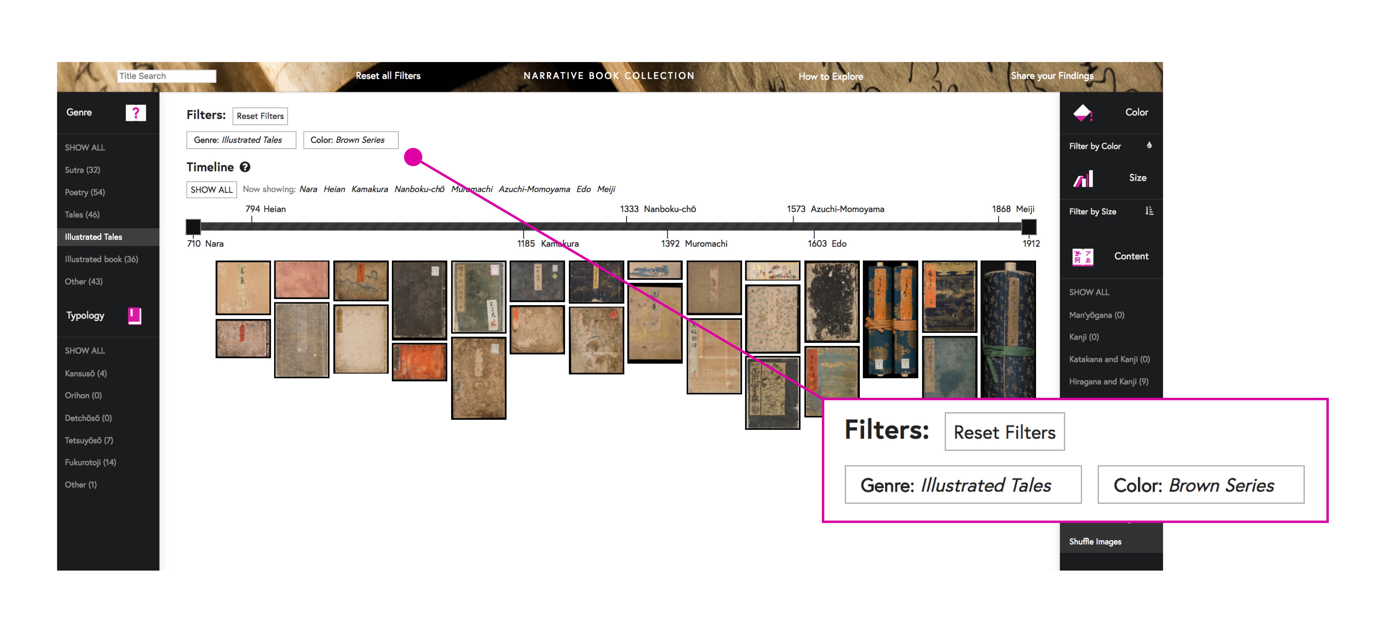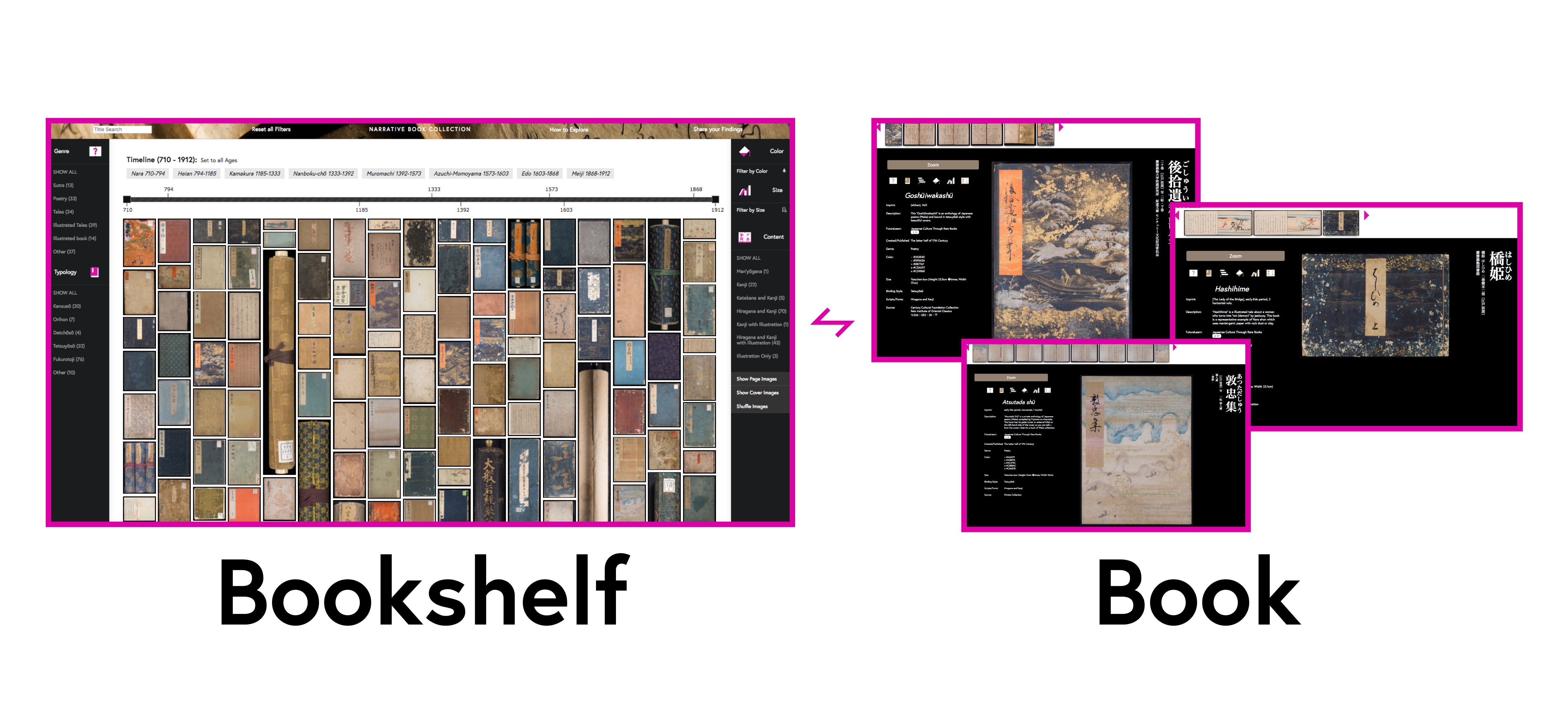 Accordingly, the Narrative Book Collection enable new interpretations in pre-modern Japanese books through Genre, Typology, Timeline, Appearance (Color/Size), and Content. This interface enables you to explore the collection from overview to details, and compare and contrast unique perspectives of rare Japanese books.