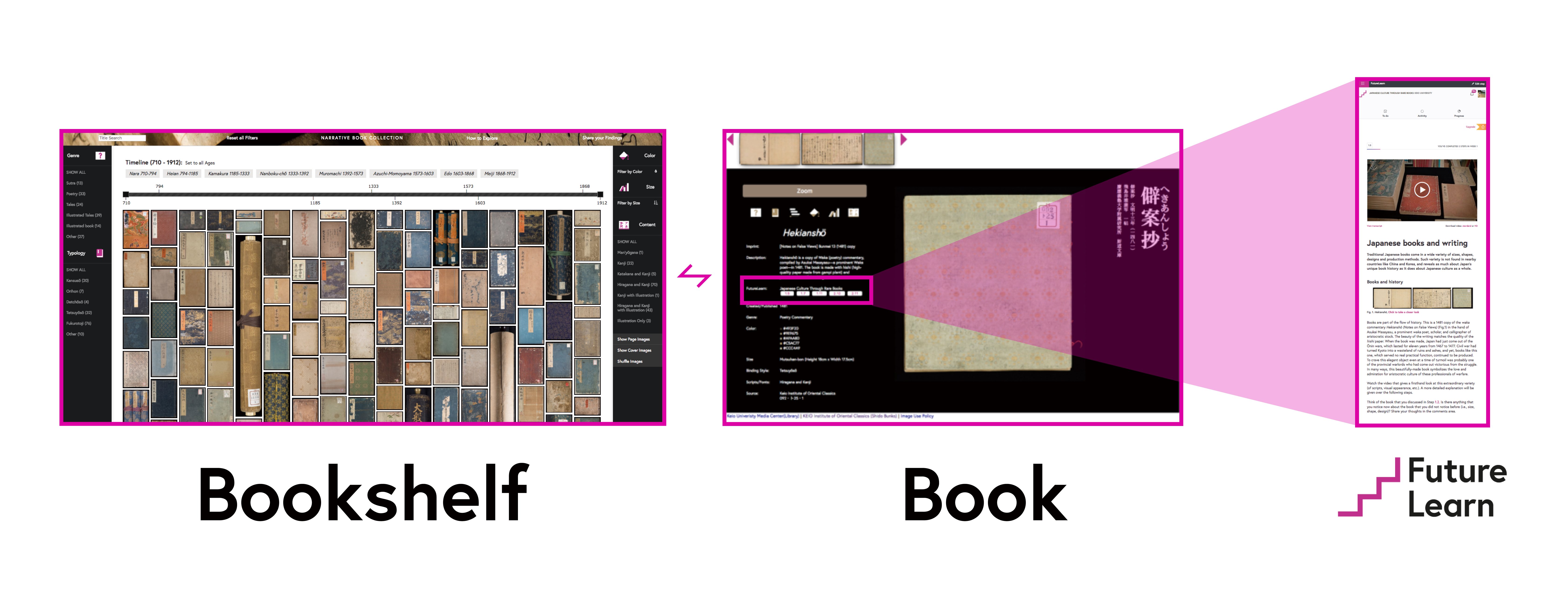 The e) link icons are all (pre) classified to the related viewpoints. These icons lead you back to the Bookshelf view page, and enable you to explore the collection again with fresh eyes. Further more, by signing up and taking the free online course Japanese Culture Through Rare Books on FutureLearn, you will be able to learn and study more about the important roles that books have played in the cultural history of Japan. *In c) detailed description of the book, there is a button link that takes you to the correlated FutureLearn course step.